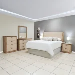 Cabecera, mesas de 2 gavetas, un gavetero de 3 gavetas con espejo y un tv de 4 gavetas.