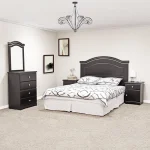 Cabecera tapizada, mesas de 3 gavetas, un gavetero de 6 gavetas con espejo.
